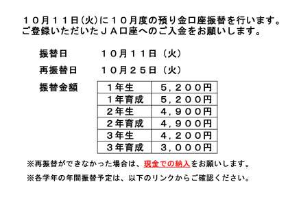10月度 預り金口座振替のお知らせ