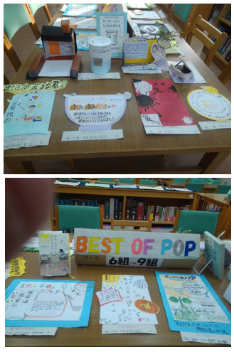 洛北中学校図書館では、クラスごとの展示に引き続き、6〜9組の作品の中から選んだ作品を展示しています。また岩倉図書館では、前半の2〜5組の選ばれたPOPを紹介しています。