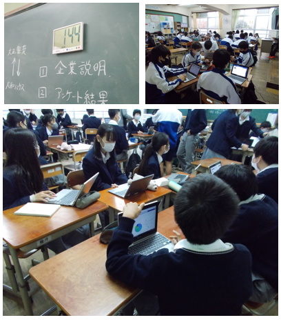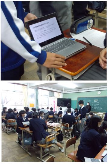 2年生の総合的な学習の時間では計10時間の授業計画で行っているインターン学習が間もなく終わろうとしています。今日は各企業から出されたミッションに対し,各班が考えた案をまとめて発表する練習を行いました。