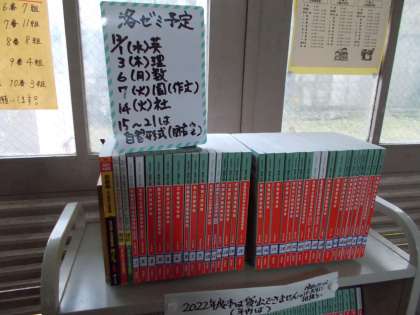 明日から21日(火)まで三者懇談会が行われる関係で短縮授業になります(給食はあります。注文していない人はお弁当を持参してください)。いつもより長い放課後になりますがどのような時間の使い方をする予定でしょうか。特に3年生は正念場です。写真は今日の洛北ゼミ(3年生の放課後学習会)の様子ですが学校に残って学習している人もいます。2職の前にはいろいろな高校の過去の入試に出題された問題集(通称:赤本)が置いてあり,借りることができます(もう1枚の写真)。家で取り組んでいる人も多数いるようです。限りある時間の有意義な使い方を実践してくださいね。