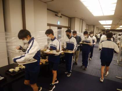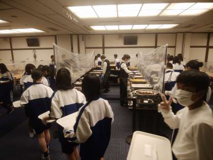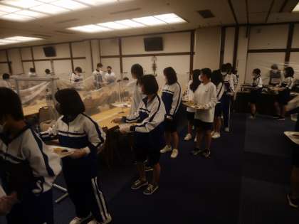 前半クラスと入れ替わって後半クラスがやって来ました。みんな行儀よく並んで料理をとっています。お腹すきましたよね。