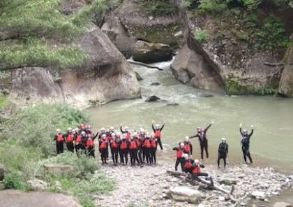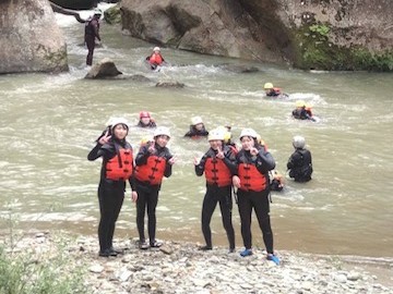 前半クラスのキャニオニングチームがゴールしました。みんな笑顔ですが、途中どんな困難があったのでしょうか?