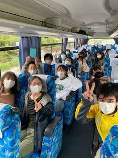 後半、ツリーアドベンチャーに向かっています。怪我もなく、体調も全員で出発です。午前中のラフティングで、はしゃぎ疲れ今は寝ている人も。到着したら元気一杯になるでしょう。