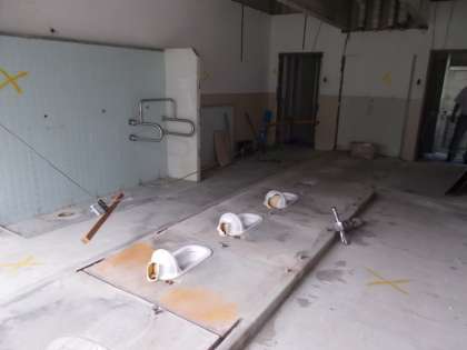 昨日のホームページで南館トイレ改修工事のお知らせをしましたが,解体作業が順調に進んでいます。下の写真は今日の様子です。びっくりですね。和式のトイレの囲いを除いて何もありません!新しい快適トイレが出来上がるのを楽しみにしておいてください。