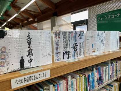 展示作品は,2年生が1年生の時に作成した故事成語ポスター。力作ぞろいの個性派ポスターには,一つ一つの故事成語の意味と由来が掲載されており,ストーリーを紹介するオリジナル4コマ漫画が秀逸です。工夫されたイラストと味のある構成は必見。展示期間は8月28日(日)までですので,もしお時間が許せば,涼しい岩倉図書館で読書をする傍ら,本校生徒たちの作品を一目見ていただければ幸いです。