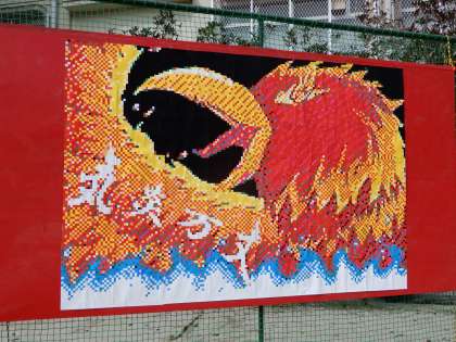 この作品は10月5日の文化祭1で武道場に展示されますので,間近でぜひご覧ください。その後,武道場の壁面に来年の体育祭までの1年間掲示します。本校のシンボル的存在です。