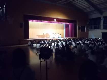 写真は昨日行われた文化祭1の舞台発表の様子です。演劇部のみなさんが,これまで練習を重ねてきた成果を披露してくれました。感染防止のため学年ごとの分散鑑賞となり,なんと3回も演じてくれました。そしてすべての回で閉幕後は大きな拍手が会場に起こりました。演劇部のみなさん,ありがとうございました!