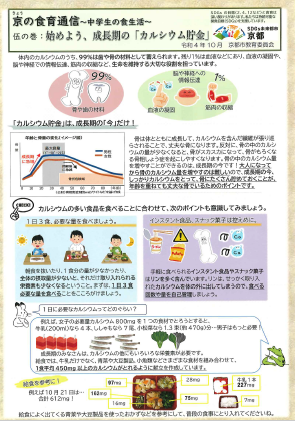 今月の京の食育通信を掲載しました。今月号は成長期の中学生にとって必要不可欠であるカルシウム摂取について掲載されています。カルシウム分の多い食材や必要摂取量,レシピなど内容盛りだくさんです。まもなく配布しますのでご家庭でもぜひご覧ください。