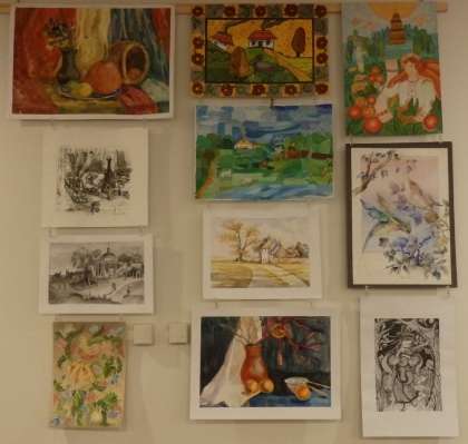 京都市とウクライナのキーウ市は姉妹都市です。そのキーウの中学生から、これまで姉妹都市交歓作品として届いていた絵画の一部が、中総文「美術展」に展示されていました。