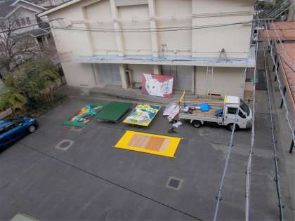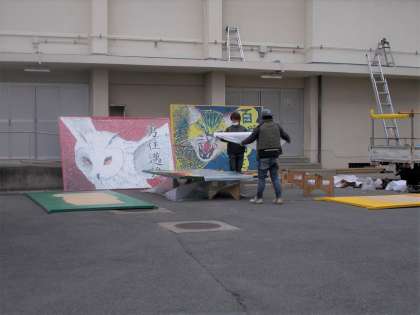 今朝から業者の方に来校していただき,今年度のアーチを武道場壁面に設置していただいています。学校祭や中学校総合文化祭でも披露されてきましたが,明日から毎日みなさんの目に留まることになります。立派な作品だけに楽しみです。