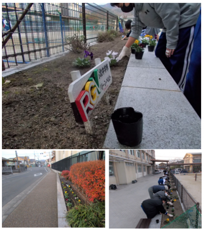 今日の委員会終了後,美化委員,有志のみなさんがRGVの花を植えてくれました。写真はその様子です。きれいな花で,みなさんの心を和ませてくれるでしょう。合わせて正門前のRGVも地域の方にお花を植えていただいています。こちらも明日には終わります。