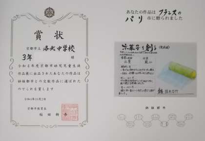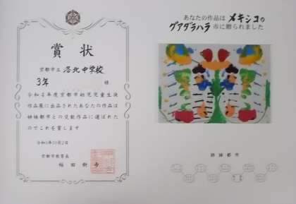 京都市幼児児童生徒作品展に出品した,本校3年生2名の美術作品が,京都市の姉妹都市交歓作品に選ばれ,1点はメキシコのグアダラハラ市へ,もう1点はフランスのパリ市へ,贈られることとなりました。きっと京都市との友好関係,さらに日本との友好関係の一助となることでしょう。選出,おめでとうございます。