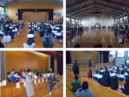 いよいよ明日が終業式、ということで本日は1〜3年生それぞれ学年集会を行います。トップは2時間目の1年生。体育館に集合し、みんなで少しゲームをやってから、クラスの総括、学年の総括へと進んでいました。