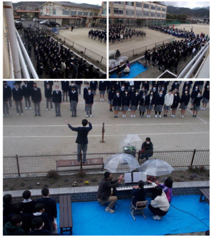 送る会の最後は3年生の合唱でした。密を避けるため,全校生徒がテニスコートに出て実施しました。小雨が降る中でしたが,3年生の素晴らしい歌声にみんな感動しました。この合唱は卒業式当日も,式後に保護者の方々にも聞いていただく予定です。