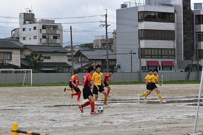 昨晩からの大雨の影響により厳しいグランドコンディションの中、ゲームが始まりました。開始早々から果敢に相手陣地に攻め込みます。