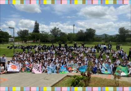 各クラスの学級旗とともに、学年写真を撮影しました。みんないい笑顔です。