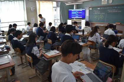合唱練習もありますが授業は授業で真面目に真剣に取り組む洛北中学生です。素晴らしい切り替えです。3年9組の社会科の授業の様子です。