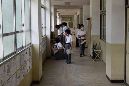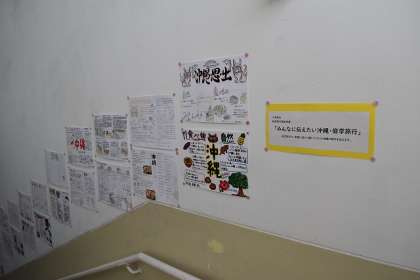 音楽室では、社会科・家庭科・英語科の授業で取り組んだ成果物が展示されています。廊下には、3年生が総合的な学習の時間に取り組んだ成果物が展示されています。