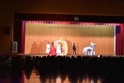 みんなが知っているストーリーですが、キャストの豊かな個性のもと音響、照明、演出もしっかりしていて見ている人を引きつけてくれました。普段、一生懸命に稽古をしている成果を全校生徒に観てもらう良い機会となりました。