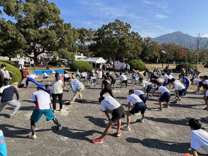 準備体操は陸上競技部キャプテン2年生Mくんが,小学生・中学生・一般の方をまじえた全体の前に立ち行いました。