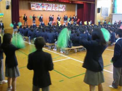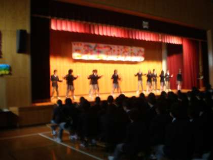 「3年生を送る会」では、最初に生徒会本部役員の出しものにつづき、3年生の3年間の思い出のスライドの上映、3年の先生方のビデオメッセージがありました。そのあと、1・2年生全員での3年生に対するエール、と合唱がありました。