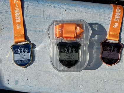 先日、紹介をしました「亀岡ハーフマラソン」において上位入賞を果たした3名の紹介と表彰式でいただいた表彰状とメダルです。とても立派なメダルが贈呈されました。改めて、おめでとうございます。