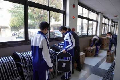 さて、今年度の卒業式では、卒業する3年生一人一人に長椅子に座るのではなく、パイプ椅子に座ってもらおうと考えています。届いた新品の椅子を1組生徒が段ボールから出してくれました。