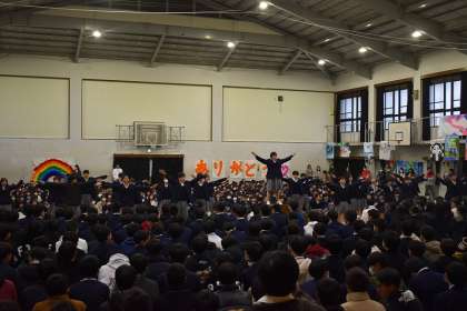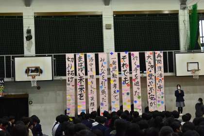 体育館内の飾りは昨日委員会の後輩たちが頑張ってしてくれました。懐かしい「学級旗」も取り付けられています。