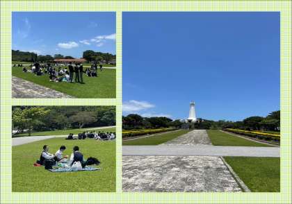 平和祈念公園の芝生で、平和に思いを馳せながら、学年の仲間と昼食を食べました。