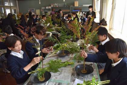 ほとんどの生徒が「はじめて」と言いながらも、説明を受け、「いける」場面となるとお花を手にイメージを膨らませ、次々と剣山にさしていきました。
