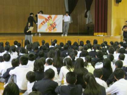 1・2年生は明日、校外学習です。1年生は、滋賀県のガリバー青少年旅行村に出かけ、野外炊飯を行います。今日は4限に学年集会を持ちました。校外学習全般の諸注意や、校外学習に持っていく学年旗のお披露目がありました。