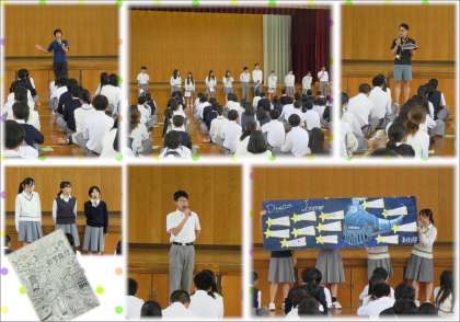 解団式後に、続けて学年集会を行いました。美術部が制作してくれた各クラス学級目標の掲示物のお披露目、生活委員長より生活点検期間のPR、学校祭に向けての取組の説明がありました。修学旅行での経験をこれからの学校生活に繋げていこうと、気持ちを新たにする時間となりました。