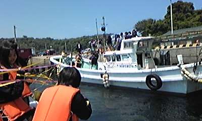 青島地区の離村式です。離村式のあと船に乗り、テープでお別れ。