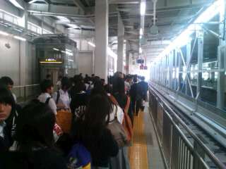 博多駅に予定通り到着しました。大きなお土産袋を持って新幹線を待っています。
