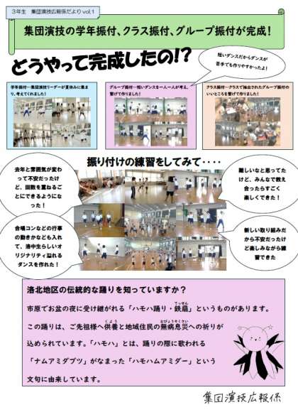 体育祭で披露する「3年生集団演技」の、各クラスやグループでの振付が完成しました。授業の中でさまざまな話し合いを重ね、生徒同士で合意形成を図り、振り付けを決定していく作業は、難しく感じる場面も多かったですが、3年生にとって価値のある学習になったようです。広報係の生徒が、全校生徒への広報フライヤーを作ってくれましたのでホームページでも紹介させていただきます。学年や学校、地域のために活躍してくれる3年生に、これからますます期待しています。行事を通して人と関わり合い、様々な経験を通して力を伸ばしてください。