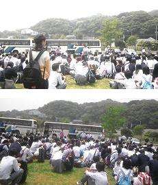 各地区から道の駅に集まってきました。これから、全員そろって博多駅を目指して出発です。