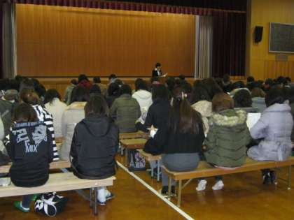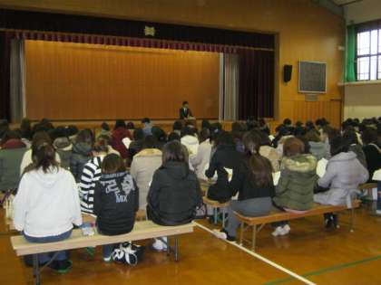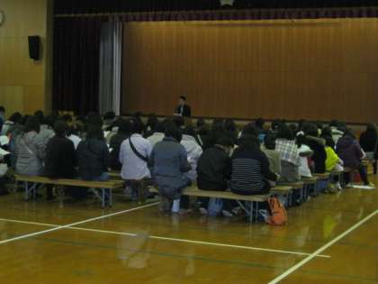 テスト1日目の午後2時より、体育館にて平成26年度入学説明会が行われました。校区6小学校をはじめとする、およそ150名の入学予定の保護者の皆様にご出席いただきました。お忙しい中ありがとうございました。本日ご欠席の方には、各小学校を通して後日資料をお配りさせていただきます。