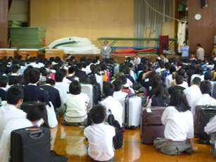 5時30分を過ぎたあたりから登校してくる人の姿が…。さて、6時から武道場で結団式がおこなわれました。校長先生のあいさつ、修学旅行委員長のあいさつ、添乗員さん・写真屋さんの紹介と続きました。最後に諸注意があって、いよいよ出発です。学校からバスの乗車場所まで、雨は降ったりやんだりでした。京都は雨、九州の天候が気になります。