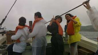 今福地区へ向かう海上タクシー。下は、田代地区の対面式のようすです。
