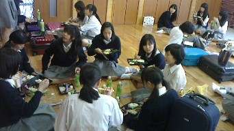 お天気は曇りです。降らなくてよかった!体験後、集会所に戻ってお弁当です。味覚体験の人は体験場所で昼食です。