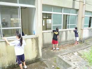 分担して、校舎の階段の手すりのペンキ塗り、壁や窓・扉などを中心とした汚れ落としや、体育館のカーテンの修理・清掃などを行いました。普段の清掃では十分に行き届かなかった場所も手が入り、きれいになりました。