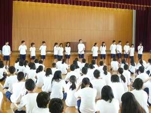 学校祭の取り組みが始まりました。午前中に黄組と緑組の縦割り競技練習と、午後から合唱練習でした。縦割り競技練習では、初めに団長のあいさつがあり、集団演技と展示のリーダー及び色担当の先生方の紹介、取り組み期間中の注意や担当の先生からの言葉と続きました。この後、さっそく競技ごとに別れて、競技の説明や練習に取り組みました。