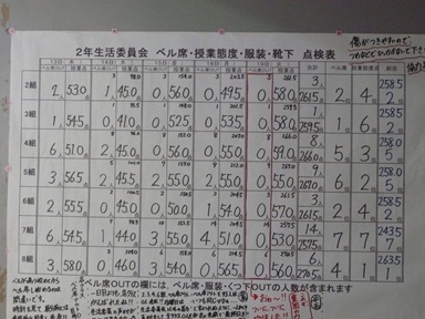 テスト週間中、生活委員会では、ベル席・授業態度の点検に取り組みました。各学年のフロアに点検表が貼られています。写真は、2年生の結果です。どのクラスもしっかり取り組めたようです。しっかりと授業を受けることができたようです。