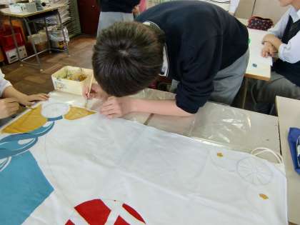 テストも一段落, ということで, 放課後の美術室では各クラスの精鋭たちが学級目標を記したクラスの学級旗づくりに励んでいます。まだまだ作り始めたところで, どのクラスのものもこれからどんな旗になっていくのか想像もつきません。クラスを代表して毎日黙々と作業してくれているみなさん, どうもありがとうございます。みんなにお披露目できる日がとても楽しみです。