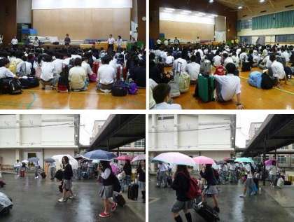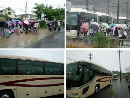 大雨の中、午前6時に学校に集合した3年生です。先生方からも、「こんな雨の中の出発は初めて…」という声も。予定より少し早い目に学校を出発し、バスまで移動。6時45分頃、京都駅目ざして校区を出発しました。