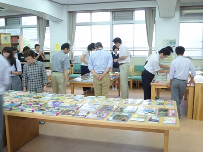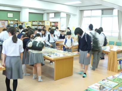 テスト終了後の12時15分から図書館にて今年度初めての選書会があり、終学活を終えた生徒と先生たちで賑わいました。図書館の机には、希望のあるジャンルの中から本屋さんと相談したものや、他校の図書館やカタログを参考にたくさんの本が並んでいました。入口で図書委員からもらった付箋を手に、参加者は購入希望の本に付箋を貼っていきました。先生方を除いて100名を超える人の参加があったそうです。