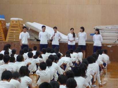 今日から学校祭の取り組みが始まりました。学校祭が終わるまで特別時間割で、6限の合唱練習に続いて集団演技と展示の取り組みが45分間あります。今日は取り組みの初日ということで、初めに赤組はグランド・緑組は体育館・黄組は武道場で結団式をおこないました。結団式後、集団演技と展示に分かれて取り組みをおこないました。下の写真はそれぞれ結団式で挨拶をしている3年生のリーダーたちです。取り組み期間中、3年生のリーダーが先頭に立って組の人を引っ張っていきます。この取り組みは、10年以上続いている本校の伝統行事です。