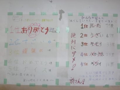 1年生の廊下に、「増やしていきたい言葉・減らしていきたい言葉」のランキング結果が掲示されています。学校生活をより充実させるために1年生で考え取り組みました。今日の1年生の学年通信にこんなことが書かれていました。『1年生の会話を聞いていて気になることがあります。それは、みんなの言葉づかいです。「ムカツク=腹が立つ」「ウザイ=うっとうしい」「キショイ=気持ちが悪い」など。もともとの言葉を、違う言い方や違った意味合いで、簡単に使っている人が多いように思います。深い意味ではなくても、聞いていて、いい気はしません。人間誰しも、腹が立ったりすることはあるけれど、これはすごく危険なことなんです。』と。ランキング結果は、1年生の人の素直な気持ちがあらわれているのではないでしょうか。居心地のいい学年をみんなでつくるために、一人一人がどうしていかねばならないのかを、しっかり考えていきましょう。