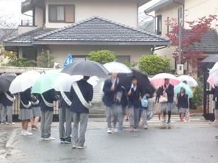 今日から冬服へ移行です。ブレザーを着て登校する人のようすを校門付近で撮りました。冷たい雨が降る中での登校風景です。雨の中、生徒会本部役員選挙に立候補している人たちが、選挙活動をしていました。