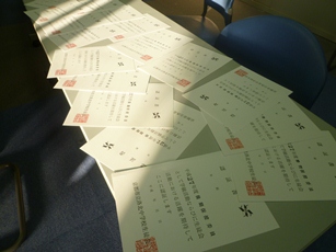 昨日紹介した新しい生徒会本部役員は、放課後さっそく初仕事に挑みました。来週金曜日の生徒会認証式に向けて、認証書づくりをしました。学年・クラス・役員名・日付などのゴム印を丁寧に押していく作業です。担当の先生が言われるには、「(2回目になる)4月には、上手に押すのですが…」とのことです。慣れない手つきで失敗もあったようですが、丁寧に作業を進めていました。お疲れ様でした。